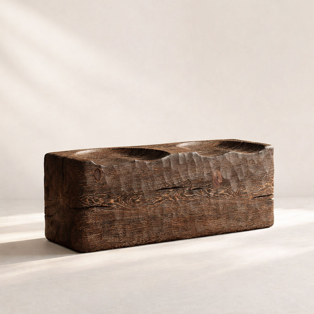 Crafted by hand from sustainable Ponderosa Pine, the Arado Bench is a striking blend of rustic charm and functional design. Its three carved seats, inspired by those found on vintage tractors, are thoughtfully arranged, with one seat facing the opposite direction for added versatility and visual interest. The hand-textured adze surface highlights the natural grain of the wood, giving each piece a one-of-a-kind character. Perfect for hospitality settings, the Arado Bench invites guests to pause, rest, and enjoy its timeless appeal.