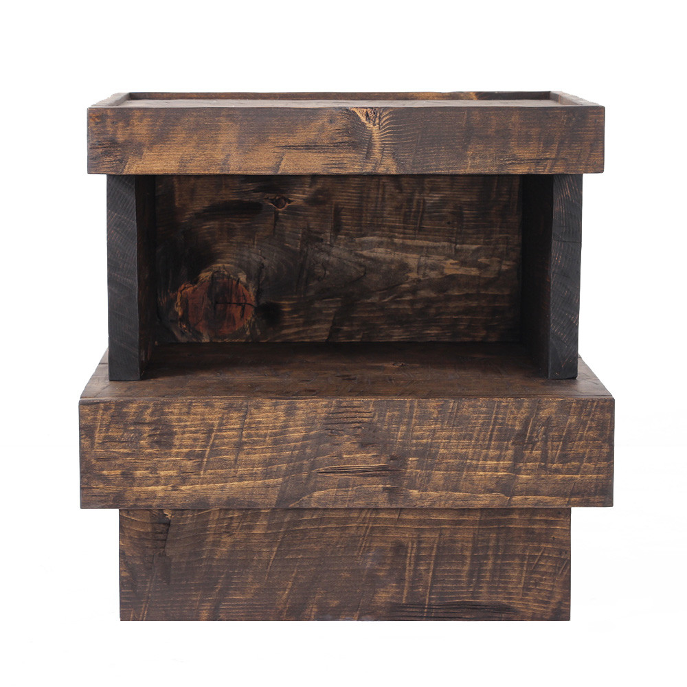 This dark wooden bedside table is a testament to bold design and meticulous craftsmanship. Handcrafted from solid Sugar Pine, this nightstand features stepped-in lines and striking wood graining, enhanced by a hand-hewn surface texture. It offers two surfaces and a low drawer, providing ample space for display and storage. Available in two sizes and multiple finishes, this piece can be customized to complement various interior décors. Each table is equipped with nylon glides for easy movement and floor protection. Proudly made in New Mexico, USA, the Durango Bedside Table embodies both functionality and rustic elegance.